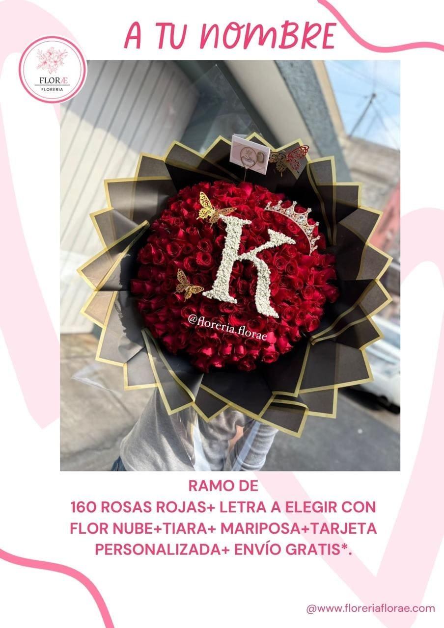 Ramo de 160 rosas rojas + Letra (a elegir) con flor nube + Tiara + Mariposa + Tarjeta personalizada + Envío gratis en CDMX y EDO MÉX (aplican restricciones por zona).