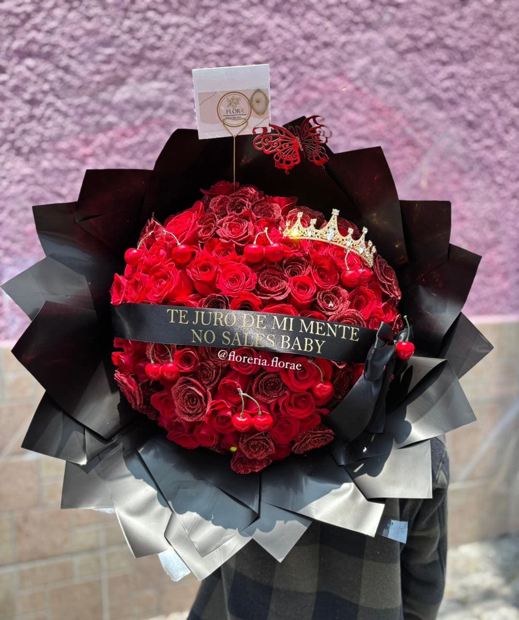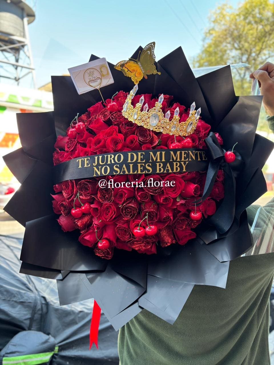 Ramo de 100 rosas rojas (40 de ellas con diamantina)+ Tiara + Cerezas de fantasía + Mariposa + Dedicatoria + Listón (leyenda a elegir) + Envío gratis en CDMX y Estado de México (aplican restricciones por zona).