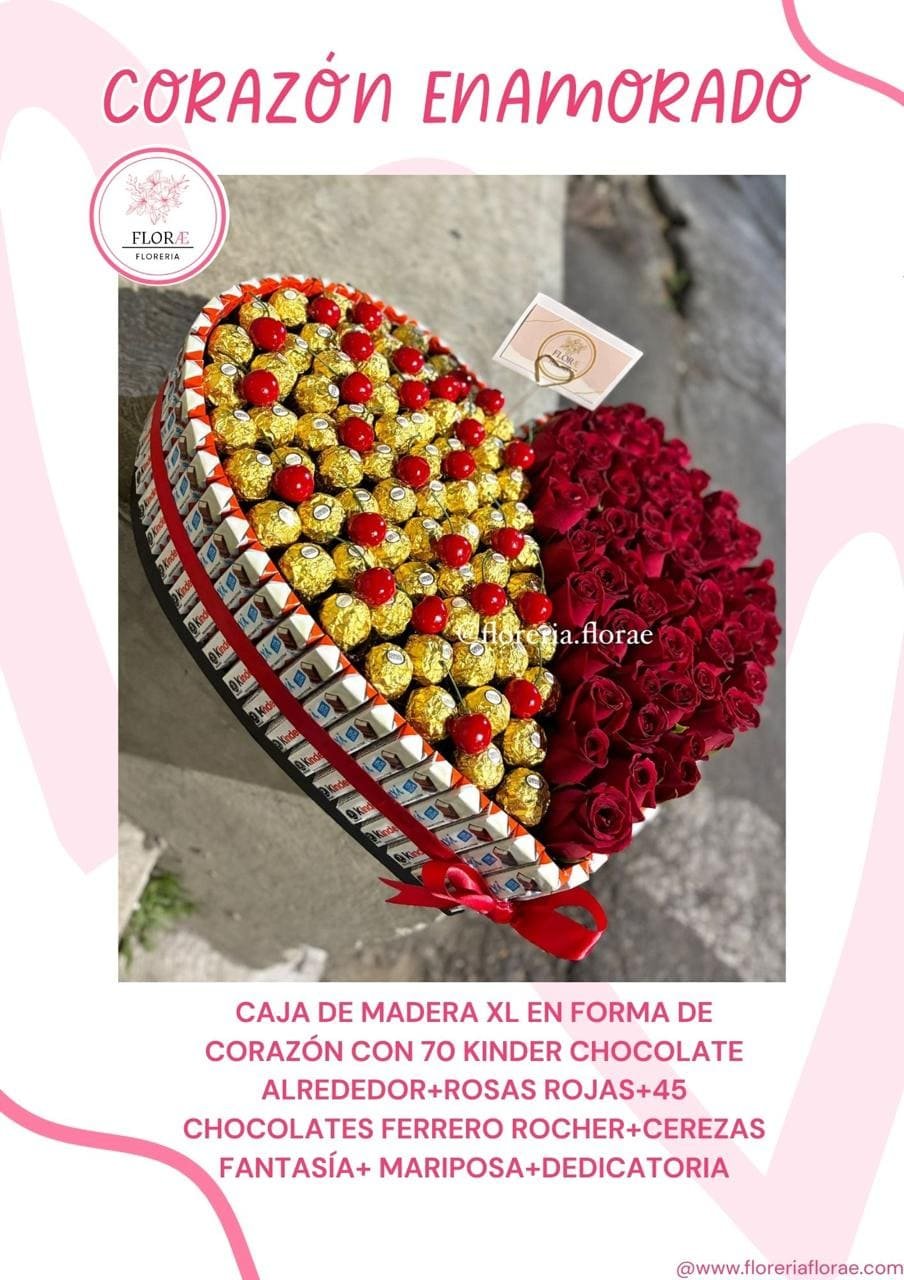 Caja de madera XL en forma de corazón con 70 Kínder Chocolate alrededor + Rosas rojas + 45 chocolates Ferrero + Cerezas de fantasía + Mariposa + Tarjeta personalizada.