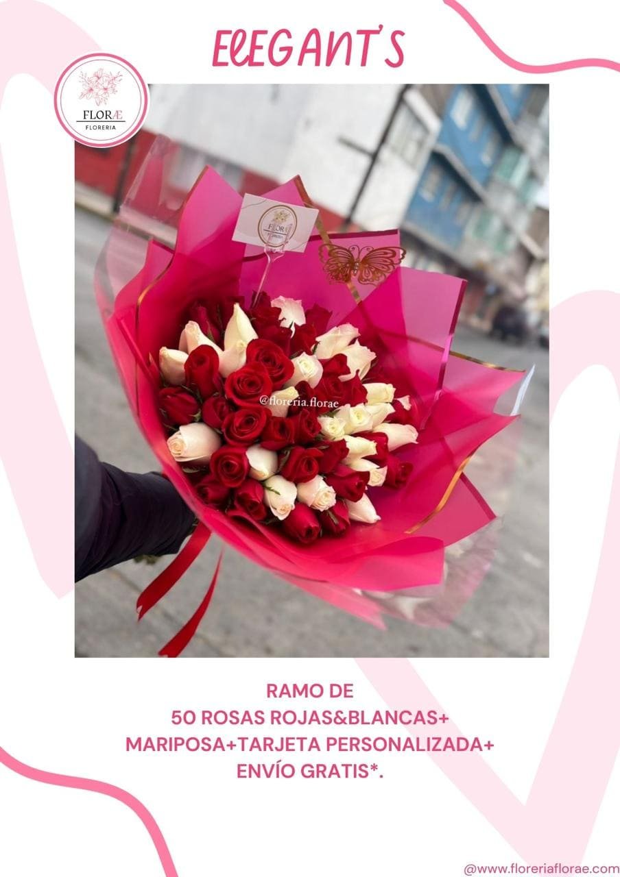 Ramo de 50 rosas combinadas (blancas & rojas) + Mariposa + Tarjeta personalizada.