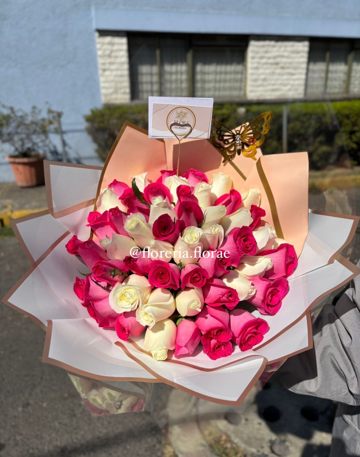 Ramo de 50 rosas combinadas (fiusha/blancas) + Mariposa + Dedicatoria + Envío gratis en CDMX y EDO MÉX (aplican restricciones por zona).