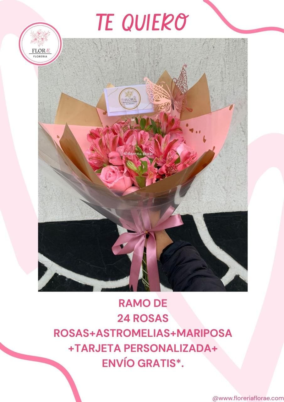 Ramo de 24 rosas rosas + Astromelia + Mariposa + Tarjeta personalizada.